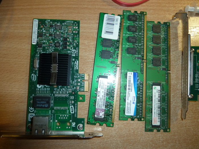 Встроенные 2 сетевые отключил, и поставил эту. Рядом оказавшиеся совместимыми планки DDR2. Хотел в начале пути поставить ECC планки из списка, но дешевых на тот момент не было.