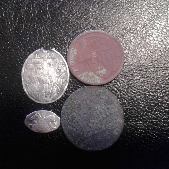 Благо, в нашем месте эти сигналы идут в перемешку с настоящим средневековым серебром и медью. Иногда в буквальном смысле. Это удивительная находка попалась моему напарнику. Вначале он принял её за не частую полушку времен Петра I. Уж очень похож орел на ту эпоху, но когда стал чистить её оказалось, что она не из меди. С одной стороны чистое серебро, с другой вроде как медь. Первый раз я вижу такую диковинку. Кто знает, что это подсказывайте! За качество фото прошу прощения, на 9-ой минуте видео её можно разглядеть подробно.
