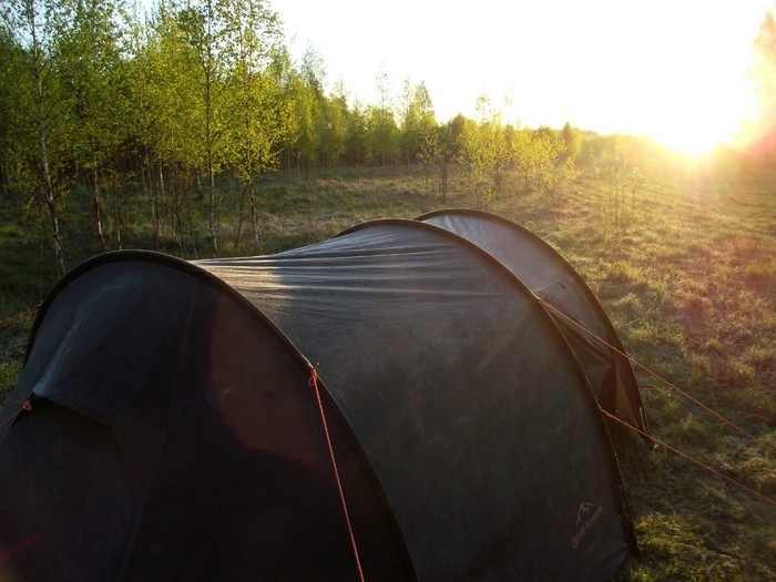 Вылезать из спальника не хотелось, тут тепло и сухо, а на улице раннее дождливое утро.
