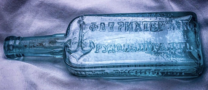 Этот пузырёк с множеством странных надписей со всех сторон является ничем иным как упаковкой от обезболивающего. Правда ни один современный человек не поймёт, что там написано. Диктую: "Ф.Ад.Рихтеръ Рудолштадт Пенъ Экспеллер Якорный охр. марка". Вот такая вот рельефная надпись присутствует на представленном флаконе. Если немного разобраться в этих странных надписях всё становиться более менее ясным. Рихтер – судя по всему фамилия промышленника, имеющего отношение к производству данного средства, Рудольштадт – город в Германии – возможно родина рецепта, пенъ экспеллер – производное от английского pain expeller (переводится как болеутоляющее), якорный – скорее всего торговая марка – типа современного товарного знака.