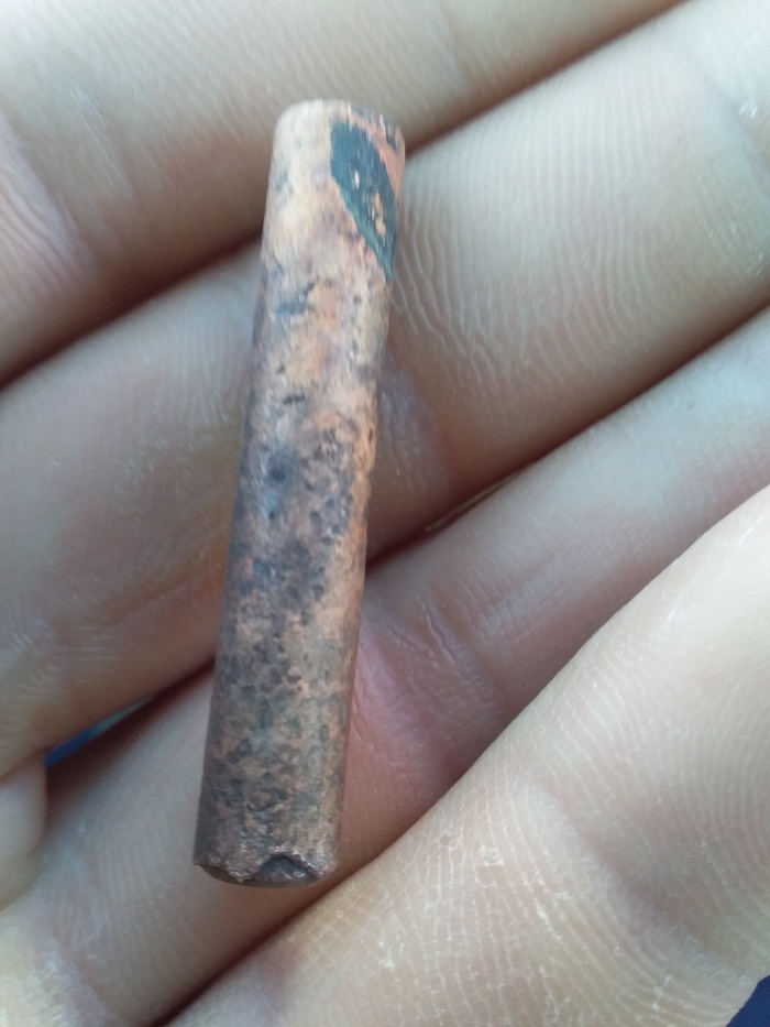 Шарообразная штука с маленьким горлышком видится мне как штуковина для пороха. Непонятный кусок лёгкого металла справа снизу я так и не опознал. Может часть от иконы? С обратной стороны выпуклость в виде шипа. Сверху слева явно ручка от какого то маленького сундучка или что то в этом роде. А вот "стрелка" это точно элемент старого ткацкого станка.