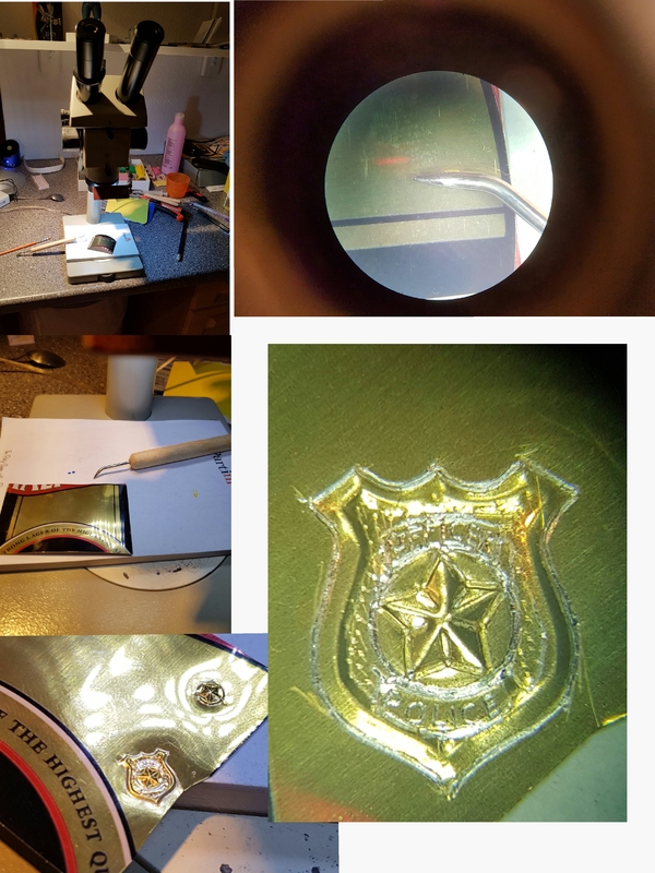 Чтоб сделать значёк, мне пришлось использовать микроскоп, изогнутое шило и кусок баночки от пива золотистого цвета. Методом чеканки нацарапал значек. Позже круглый фон за звездой покрасил в синий цвет.