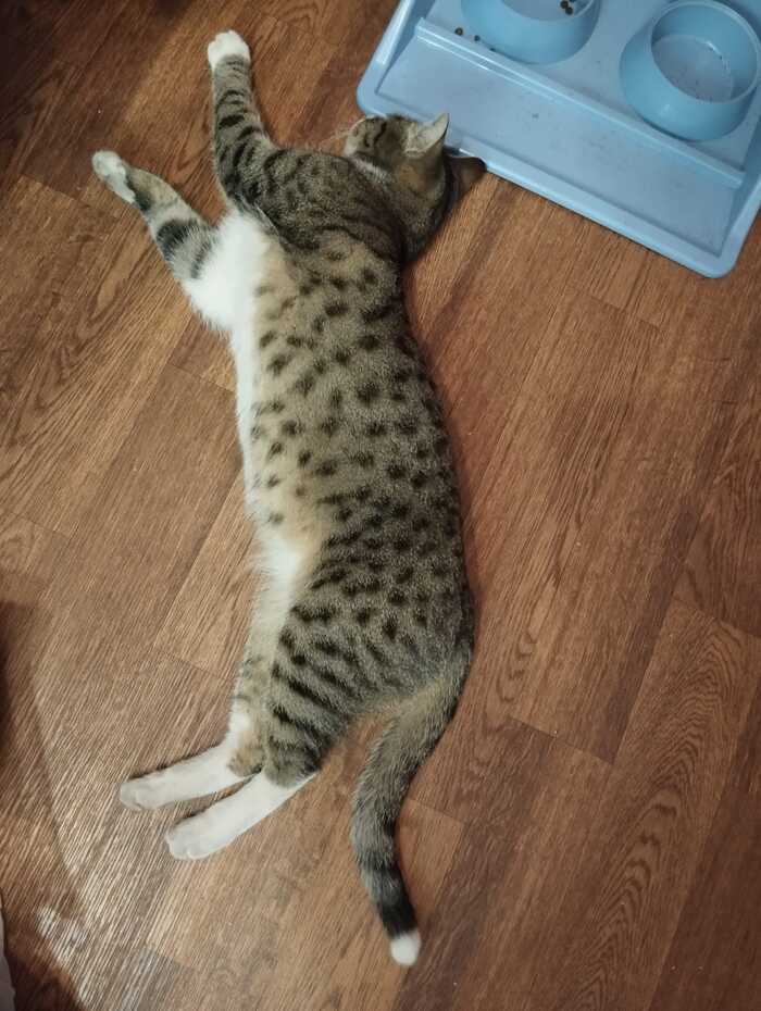 Освоился в дому. С начала ел с опаской, оглядываясь на открытую дверь. Попробовала закрыть, ой, что было, заметался, зашипел, зарычал. Голос страшный... Всю ночь вздрагивали сквозь смех м слёзы -завели котика! Прошло и это. Привык. Успокоился. Перестал ломиться в дверь.