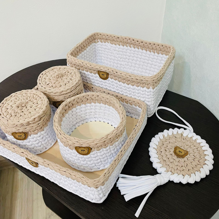 Друзья, доброго времени суток! Моя любимая супруга решила начать собственное дело, и в качестве первого изделия связала такой комплект для мам, здесь можно разместить подгузники, салфетки, крем, ватные палочки и остальные необходимости.
