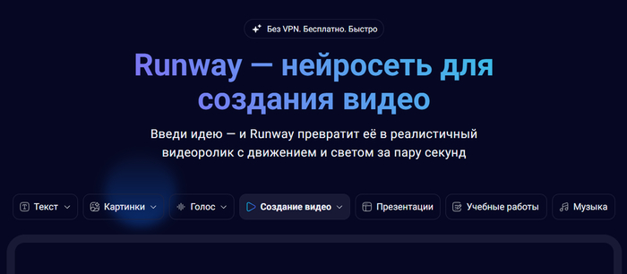 Функции: генерация видео из текста, превращение изображений в анимацию, редактирование видео с ИИ, добавление движения и эффектов, ключевые настройки движения, поддержка современных моделей Gen‑3/Gen‑4/Gen‑4.5, экспорт в высоком разрешении