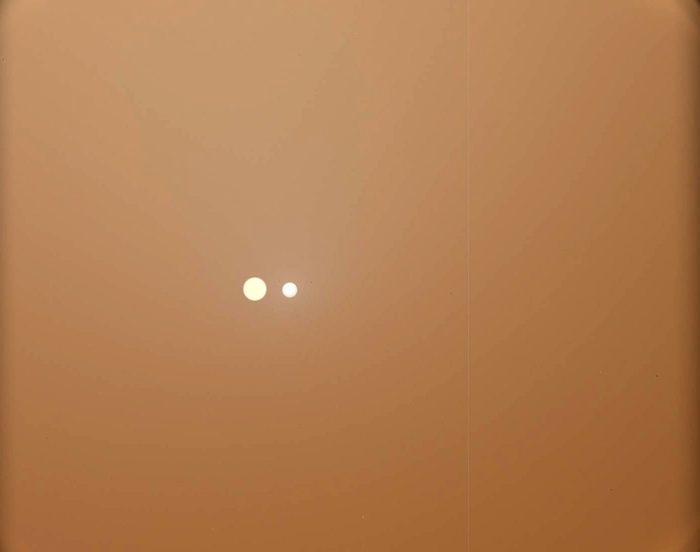 Сравнение размеров Солнца на Земле (слева) и на Марсе (справа).
