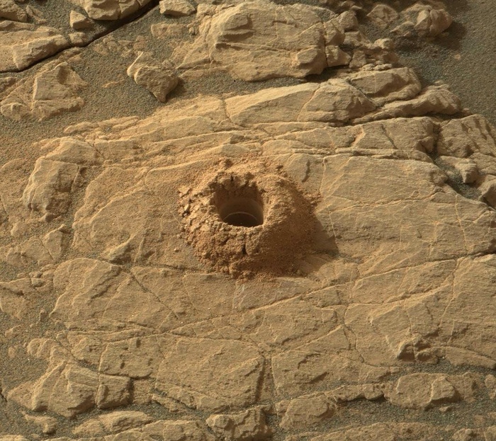 Марсоход Curiosity, после бурения в кратере Гейла. Источник NASA, октябрь 2015г.