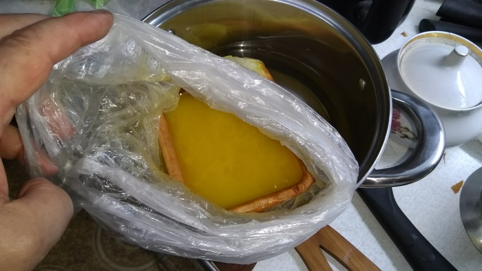 Уложил в кастрюльку вариться в льняном масле с пчелиным воском