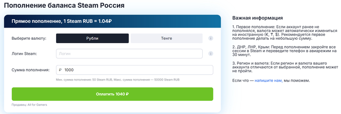 Введите логин от своего Steam-аккаунта, укажите нужную сумму к зачислению и оплатите любым удобным способом — например, через СБП.