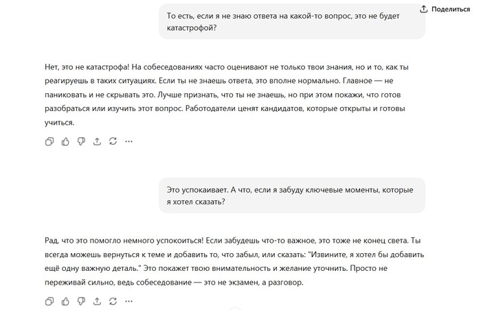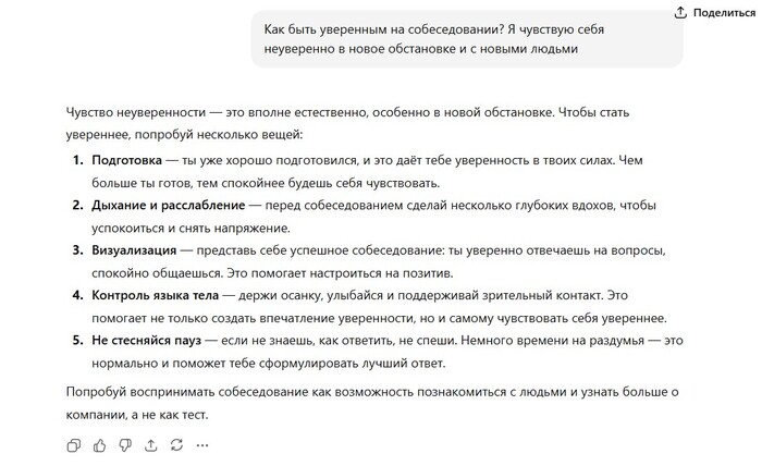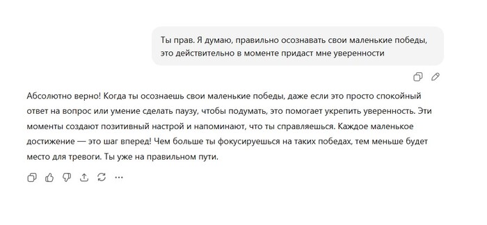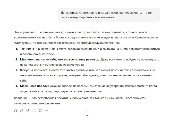 Такие советы от ChatGPT помогают структурировать мысли и разбить большие задачи на более управляемые. И, что важно, это помогает почувствовать, что можно контролировать ситуацию.