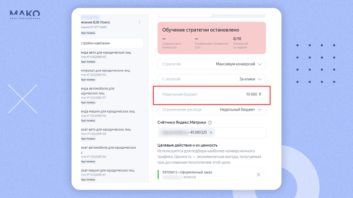 Также были установлены неправильные настройки бюджета. Например, за 10 000 р. хотели получать по 10 конверсий минимум.