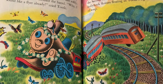 А вот американская книжка про паровозик и ромашки (1945). Сюжет там не как в советском мультфильме (1967), но есть параллели.