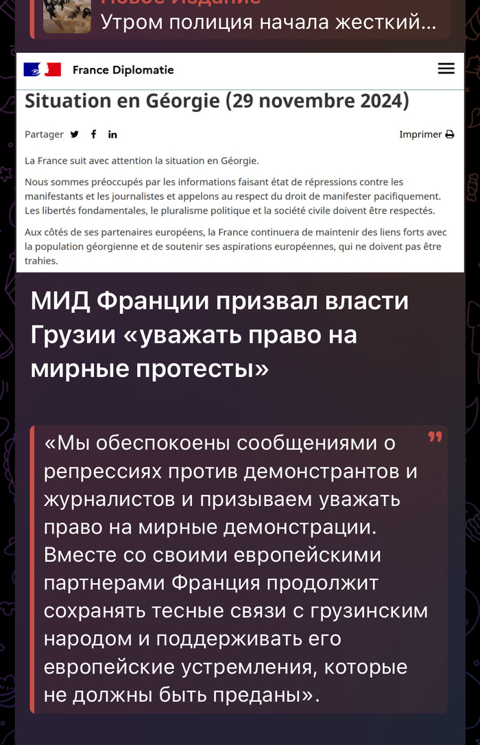 Грузины, братья! Вы все правильно делаете, выбирайте сами свой путь! Закатайте этих «мирных протестующих» под асфальт! Не дайте ублюдкам отобрать у себя родину! Без родины хреново. У меня ее отобрали в 2014, я знаю о чем говорю=(