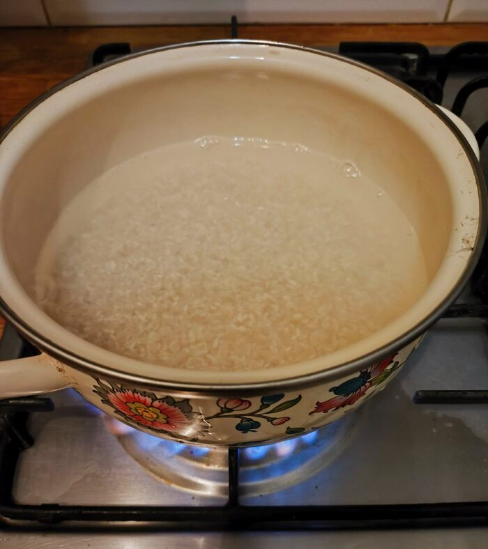 6) На САМЫЙ БОЛЬШОЙ ОГОНЬ и доводим до кипения без крышки ПОСТОЯННО ПОМЕШИВАЯ, шкрябая по дну ложкой. Если этого не делать, дофига риса налипнет и пригорит.