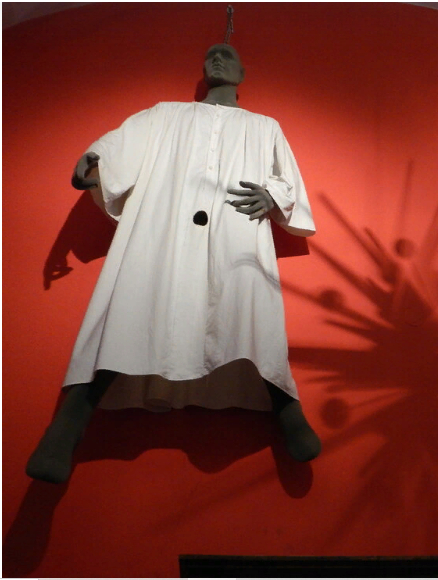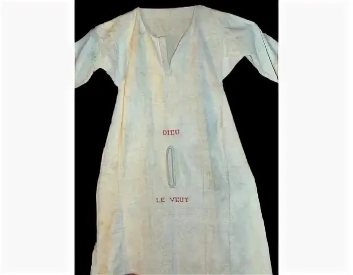 На фото женская льняная рубашка "для этого", XVII век, Франция. Надпись гласит: "Даст Бог, так и будет", что соответствует русскому выражению "На все воля Божья". Что характерно, у мужчин тоже были такие рубашки, только отверстия на них по понятным причинам были круглыми: