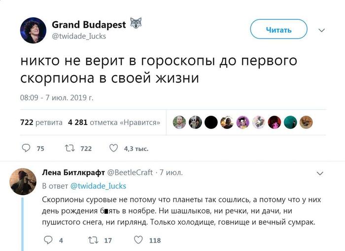 6 DimirSteel Специфический юмор Ответ на пост «Вы верите в гороскопы?» 1 день назад А почему рыбы не такие суровые. Та же хуйня, только в профиль?! Скриншот Грустный юмор Юмор Гороскоп Скорпионы Переписка Странный юмор Мат Ответ на пост Текст Ещё 0