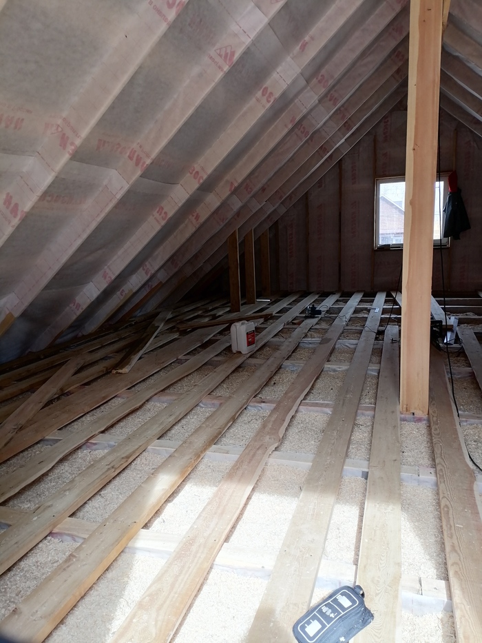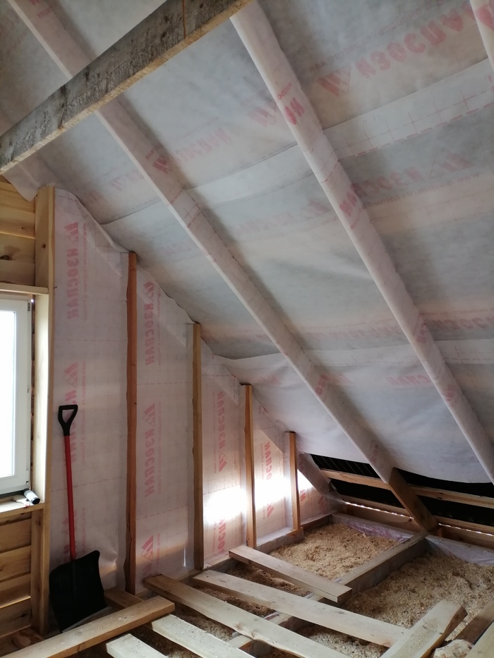 Начали мы с супругой с того, что убрали все опилки с крыши, постелили новую пароизоляцию между лаг потолка. Что там было до этого, лучше не видеть вовсе. Застройщик просто с закрытыми глазами накидал на черновой пол дырявых кусков ветрозащиты и пароизоляции, видимо обрезки которые оставались. Естественно через эту невеликую защиту на натяжной потолок сквозь щели меж досок чернового потолка сыпались опилки, и к тому моменту, когда мы с женой принялись разбирать это дело, там всё было завалено тонким слоем. Так что пришлось ещё и разбирать черновой потолок, пылесосить и протирать натяжной потолок.