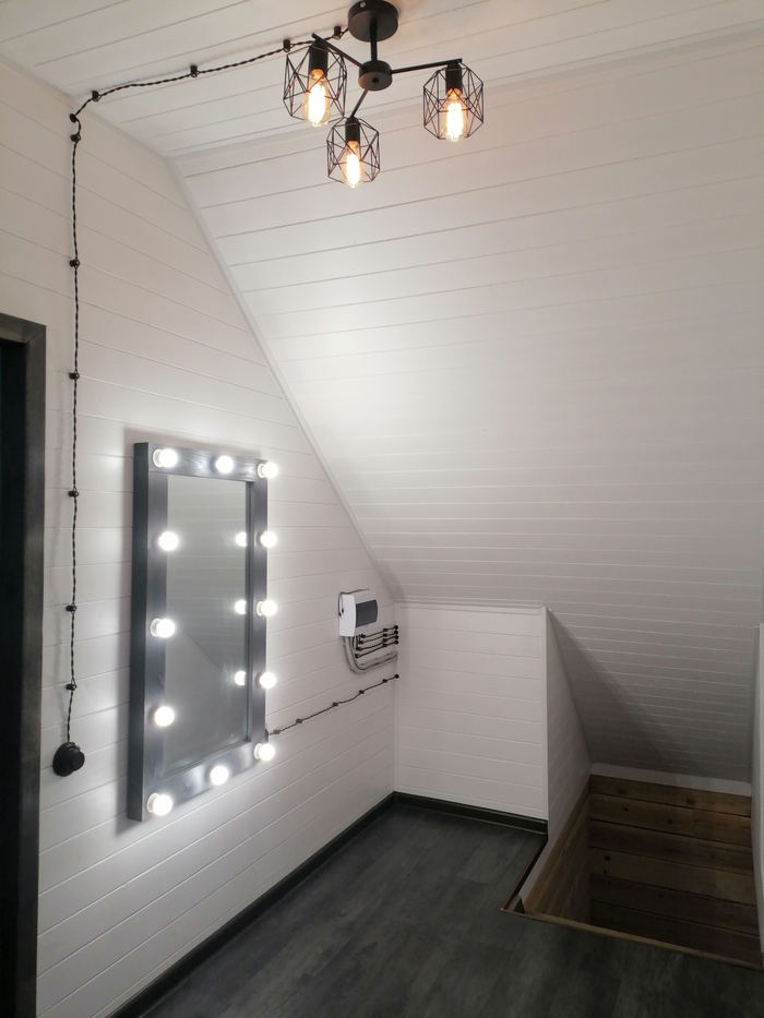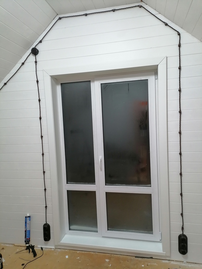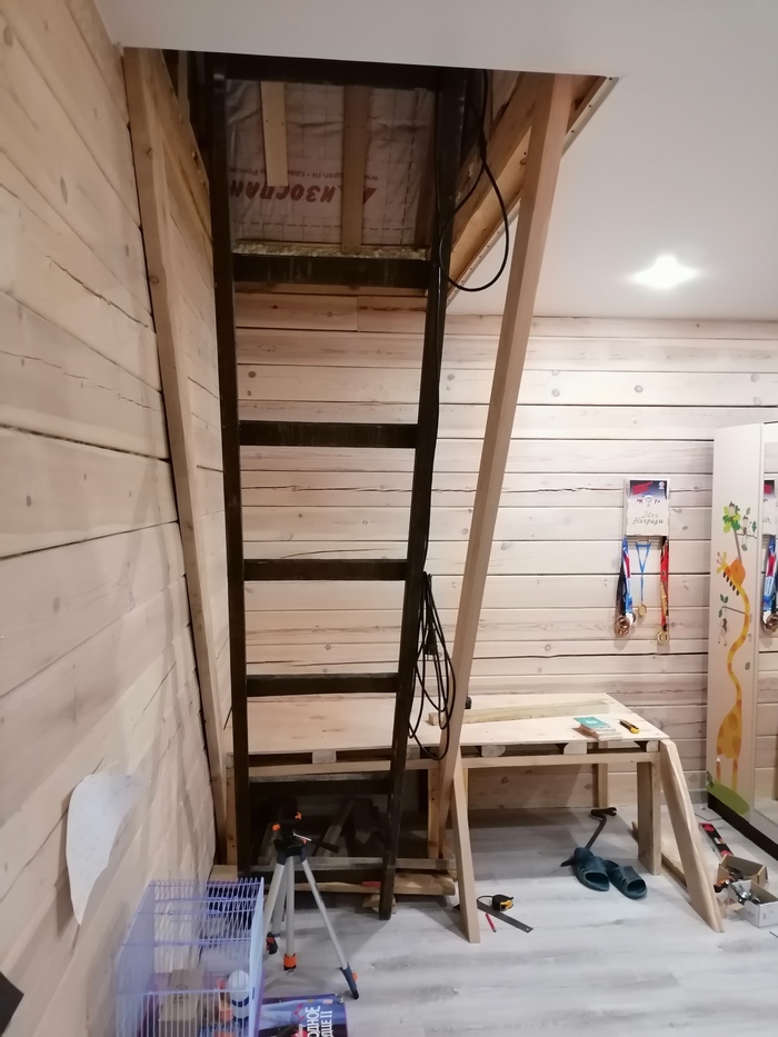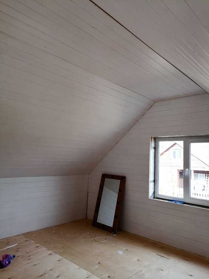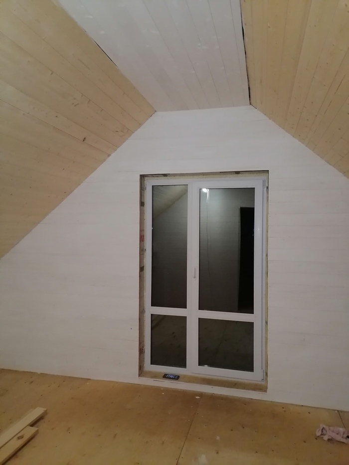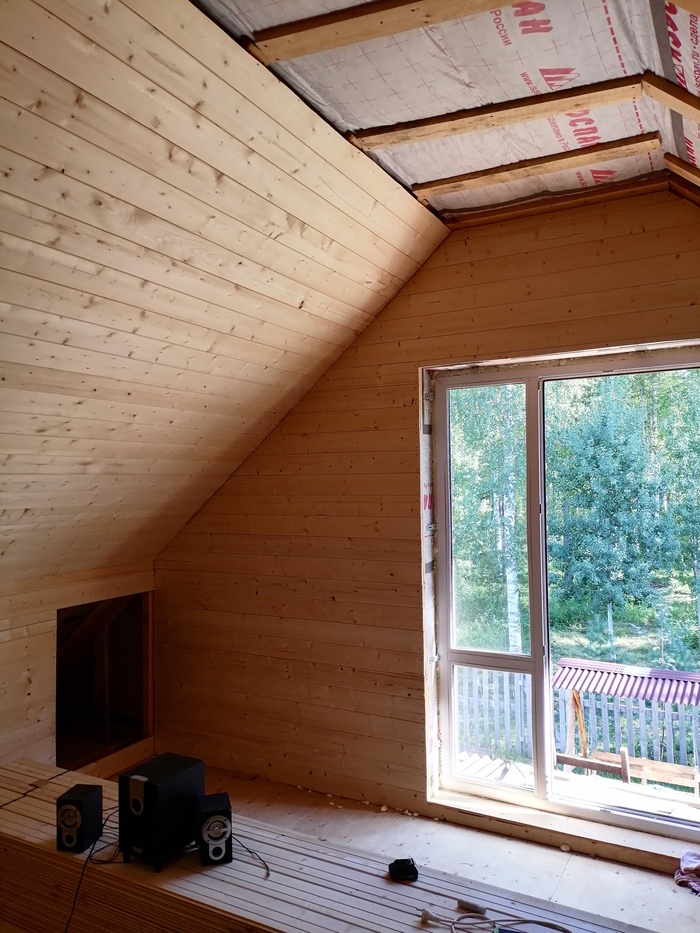 А дальше месяца два ушло на монтаж вагонки, сначала я крепил её на кляймеры, но это было ппц как долго и неудобно, да и держат они вагонку так себе. Поэтому перещел на саморезы, уже не помню какие, сантиметра 2 длинной. Кстати, на верх я лазил по лестнице через улицу. На фото видно, как выглядывает кончик лестницы в окне. ↓