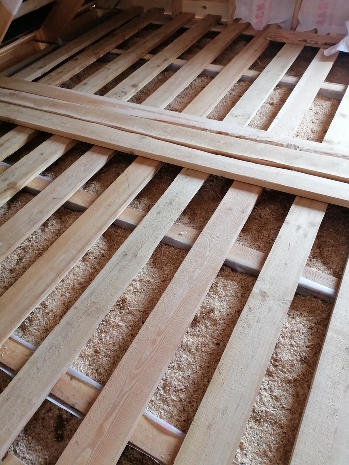 А потом засыпал туда в 3-4 см толщиной просушенных опилок. Почему не постелил минвату? Да зх. Минваты не было, а опилки были, вот их и засыпал. Основная их функция, это не дать всему теплу подняться на второй этаж.