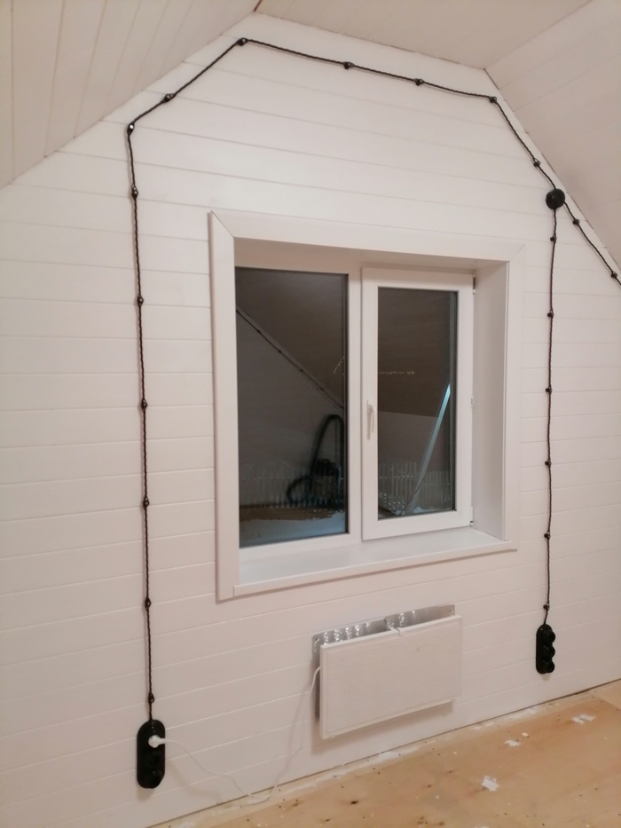 После покраски занялся электрикой. Было закуплено 50м ретрокабель 2.5*3 на розетки, и 50м ретрокабель 1.5*2 на освещение, ушло примерно по 30 метров. Скрутки в коробках пропаял. Розетки, выключатели, коробки, изоляторы, втулки тоже ретро. Керамические слишком дорогие, поэтому взял пластиковые, с виду ничем не хуже. Обогреватели взял кварцевые, 2 по 500 Вт, и их вполне хватает, даже сейчас, когда у нас ночью на улице -40 на втором этаже тепло. На первом этаже у меня тёплые водяные полы, тепло равномерно распределяется по дому и поднимается на второй этаж.
