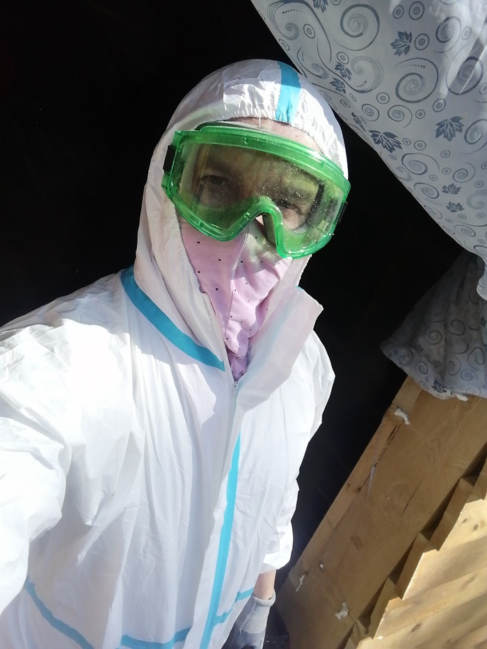 Специальный нож для резки минваты, перчатки, маски, костюмы борцов с COVID, защитные очки. И пошла потеха. Наколотил бруски с шагом 60см, и на них укладывал минвату, Пыль от её была везде: в глазах, в ушах, в носу, под одеждой. И это не смотря на то, что работали мы в закрытых костюмах, очках и в маске.