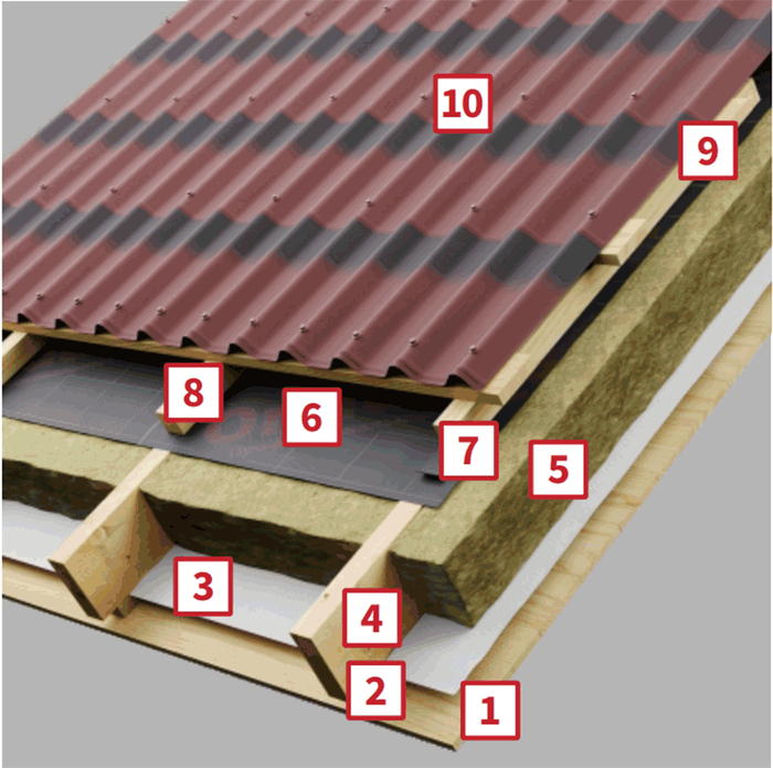 В инструкции также дана красивая и понятная картинка, как должны быть расположены плёнки, мембраны и утеплители в крыше Ондулина. И какие они должны быть по назначению.