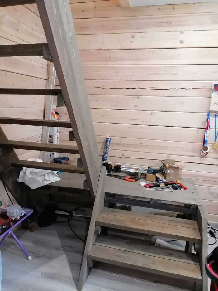 Когда с вагонкой было покончено, пришла осень, и ночами стало заметно прохладно, поэтому следующим этапом я решил наконец поставить дверь на втором этаже и сколотить нормальную лестницу из дома (временную, само собой. И когда-нибудь я её заменю. Наверное…). Колотил из оставшихся досок, покрыл износоустойчивым маслом для полов и лестниц.