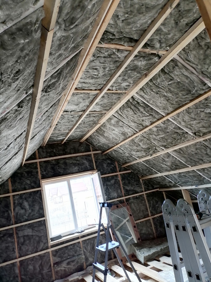 Как крепил второй слой утеплителя сфотографировать не получилось, т.к. я его прижимал с помощью пароизоляции. Пароизоляции ушло 3 рулона по 70 м2 ( 1 рулон ушел на полы).