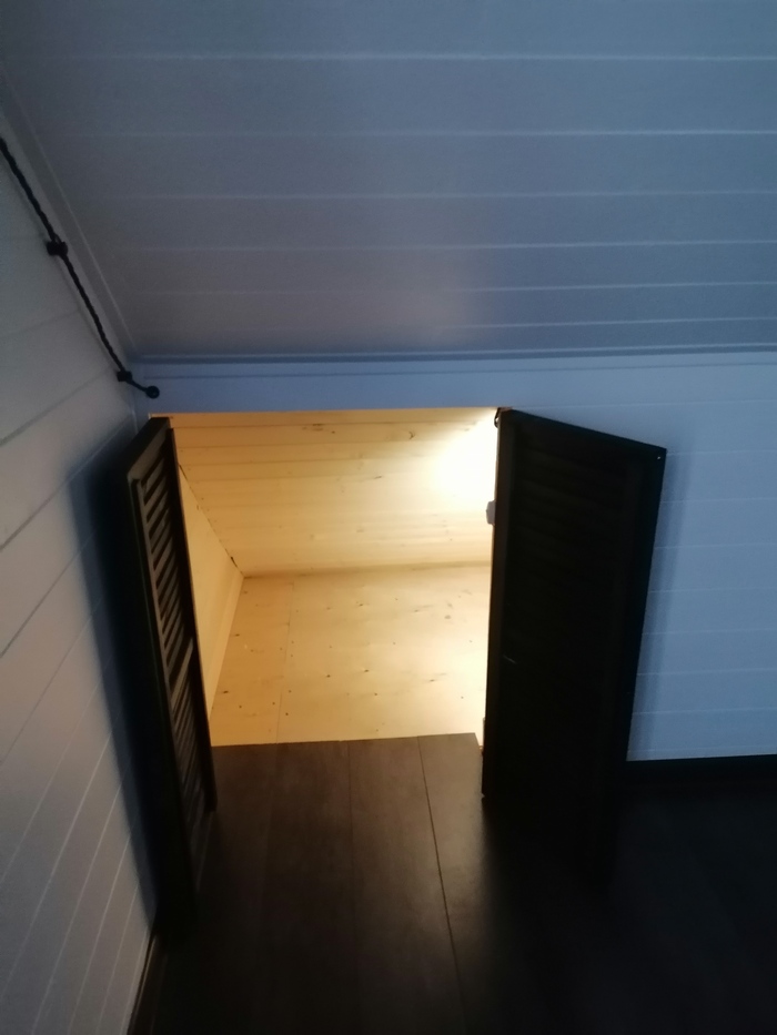 В боковых стенах сделал дверцы, провёл туда освещение. Получилось много скрытного пространства для всякого хлама, чтоб дети туда игрушки свои складывали. Дверцы покрасил водно-дисперсионной эмалью, я вот только сейчас узнал, что такая есть.