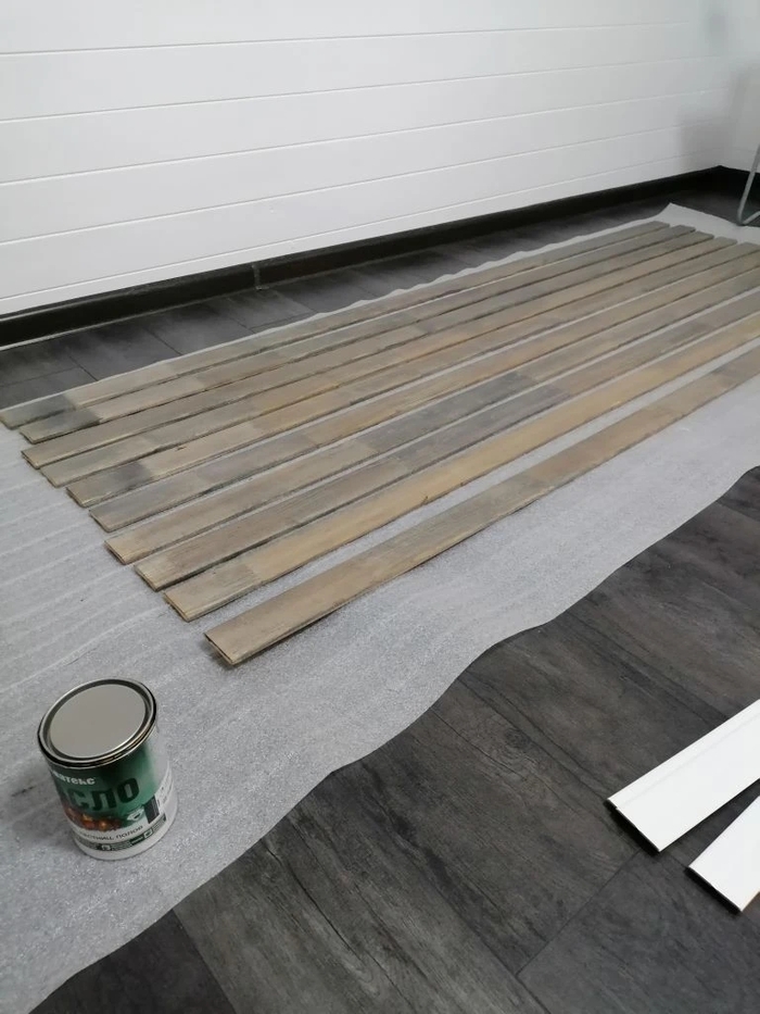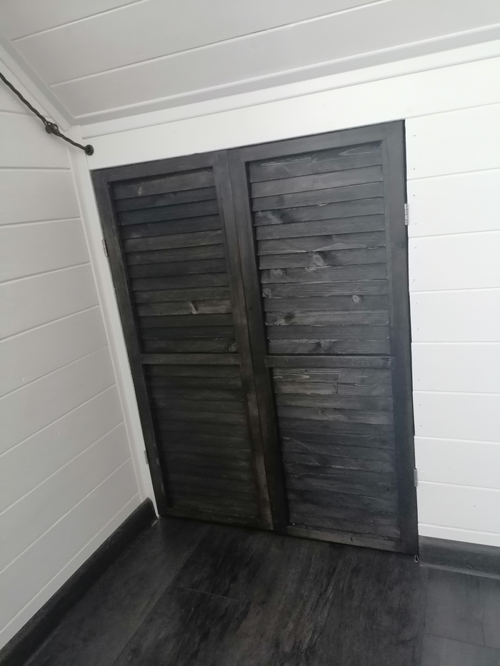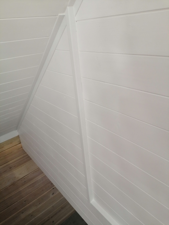 А дальше был этап покраски. Так как вагонка была не экстра класса, в ней довольно много сучков, что мне не особо понравилось, поэтому решил использовать кроющую краску белого цвета по дереву. Красил на три раза, с периодичностью в неделю (краска долгосохнушая).