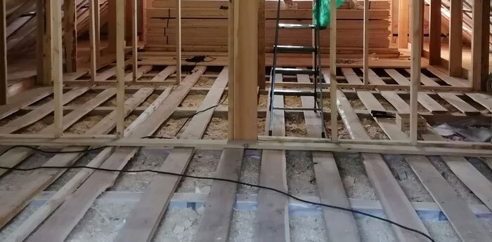 Вместо того, чтобы закатать в пароизоляцию перекрытие по лагам, ТС монтирует сверху обрешётку и предчистовой пол из фанеры. Таким образом, у нас отсутствует пароизоляционный контур мансарды, а под полами готовый мышиный рай.