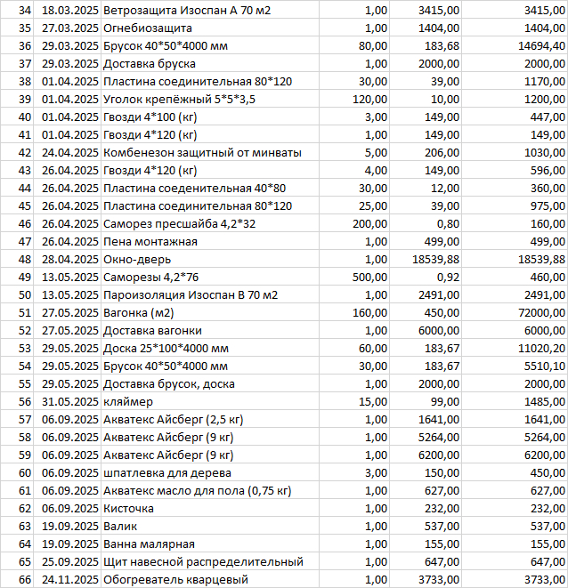 Инфу из чеков забил в табличку. Много чеков с мелкими суммами были утеряны, но денег там не много, может ещё тыщ на 10.