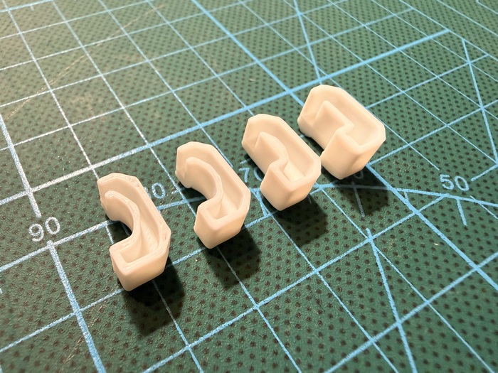 И первое, что я распечатал, это лампа жене на тумбу и заглушки для своего стола, на направляющие, которые цепляли мне штаны постоянно. Заглушки моделировал, получилось четыре итерации.