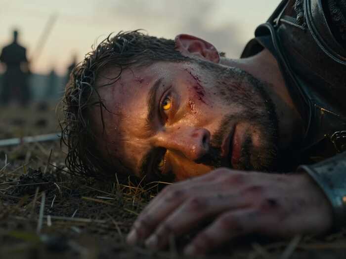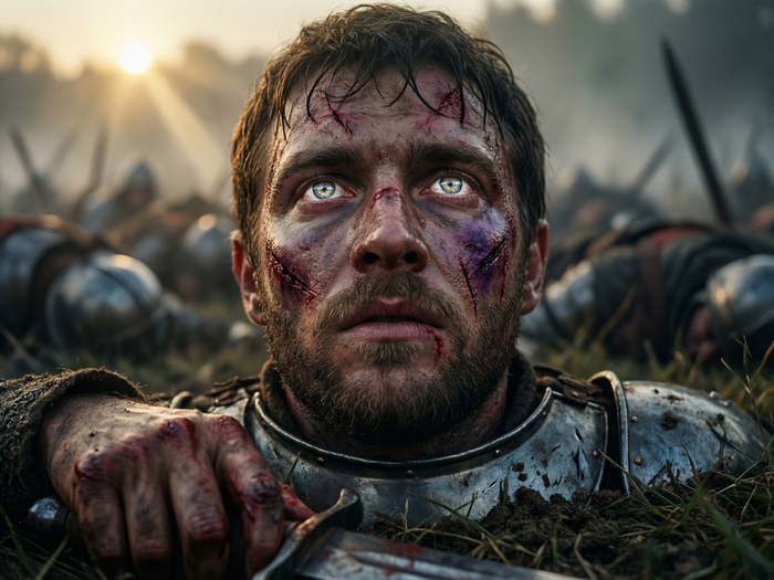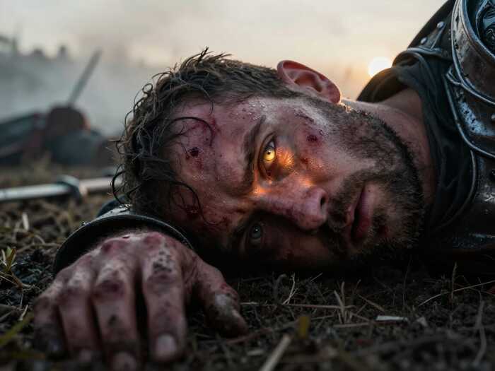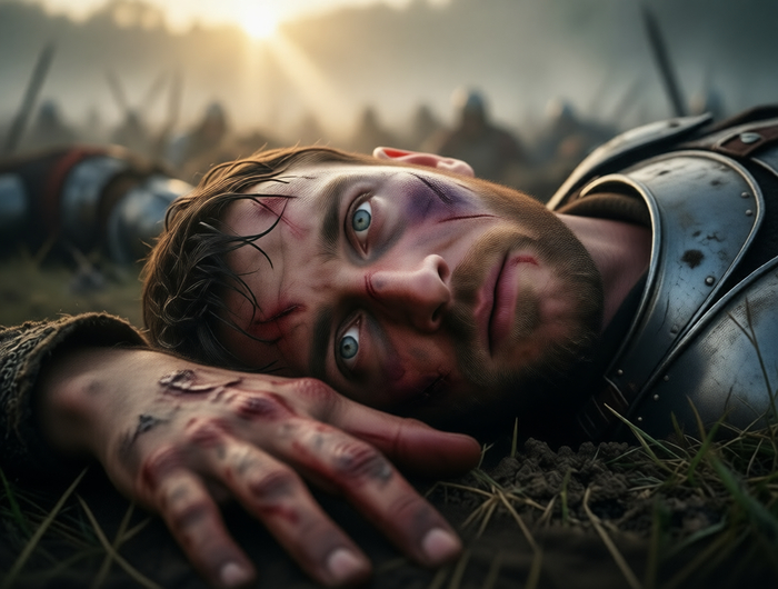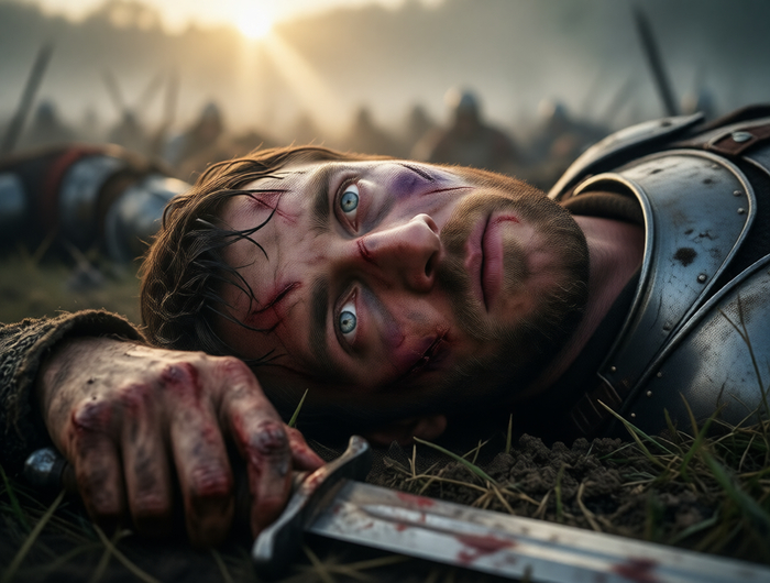 И если уж речь о картинках "для привлечения внимания" - вот свежий пример моих личных "метаний". Идея была вроде простейшей - портрет крупным планом поверженного воина на поле битвы, видящего свой последний рассвет: