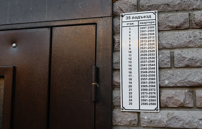 Изменение адреса стало не единственным неприятным сюрпризом для жильцов дома. Прогуливаясь по гигантскому двору вдоль парадных, изучая таблички с номерами квартир, можно понять, что и здесь творится что-то неладное. Логично предположить, что в последнем подъезде будут расположены квартиры с номерами, приближающимися к цифре 3708. Как бы не так! Последние квартиры находятся в 25 подъезде, а в 35 – нумерация начинается с 2497 и заканчивается 2588. Представляете, как курьерам или бригаде Скорой помощи искать нужного адресата?