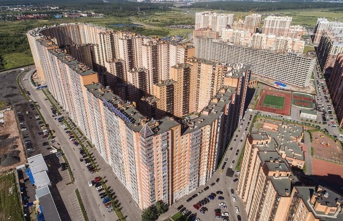Кто из питерцев не наслышан о быстро разрастающемся городке Кудрово, который хоть административно и относится к Ленобласти, но фактически является спальным районом Северной столицы. Буквально до начала 2000-х это была крошечная деревенька, которую присмотрели застройщики и начали активно осваивать территорию. Особо рьяные дошли до того, что в несколько этапов возвели гигантский жилой дом, в котором оказалось 35 подъездов и 3708 квартир! При этом его высотность варьируется от 18 до 25 этажей, и построен он в виде замкнутой структуры с двором-лабиринтом, который до отказа забит припаркованными автомобилями.