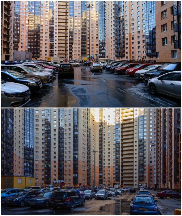 Тем, у кого квартиры расположены у фасадной части конструкции здания, повезло больше, в их окна скудное питерское солнце заглядывает каждый раз, когда появляется на горизонте, да и весь расстроившийся микрорайон можно увидеть. Хотя и смотреть то практически не на что, одни 25-этажные коробки и заставленные машинами тротуары.