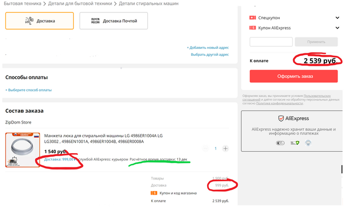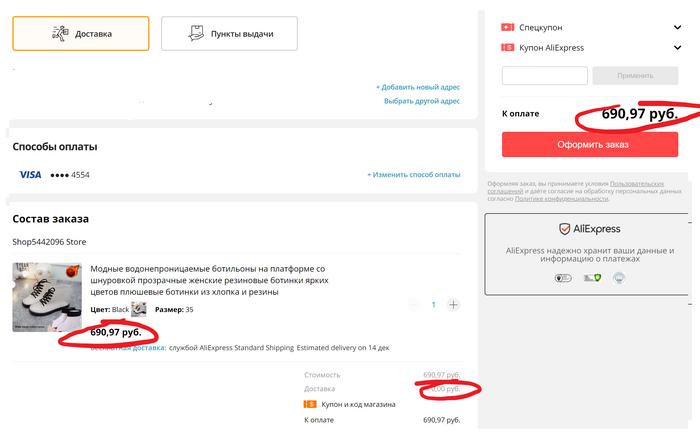 Зная "особенность" нынешнего али, когда доставка внезапно перед самой оплатой становится платной, внимательно смотрю на сумму оплаты. Там всё те же $37.24 и бесплатная доставка. Ну, то есть всё нормально. Это последняя форма перед оплатой. Осталось нажать "Оформить заказ". Доставка бесплатная.