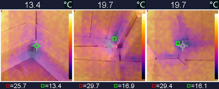 Выяснилось, что дом имеет многочисленные продувания со значительным градиентом температур. В центре как раз термофото той самой щели, мы видим, что разница между температурой в помещении и самой холодной точкой составляет более 13 градусов. Одновременно с этим обнаружились продувания по углам пола первого этажа и небольшой перекос полов от центральной оси здания к боковым стенам.
