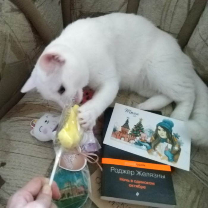 У нас тут и куча настоящих Тульских пряников фабрики "Старая Тула", пастила всякая разная, даже сушёная. Книга загадочная, как-то я упустила этот жанр в литературе, прикольные носки в мою коллекцию прикольных носков (винишко у котэ это прям топчик), еще крем для рук с одуряюще-вкусным запахом и свечечка. Люблю свечи)
