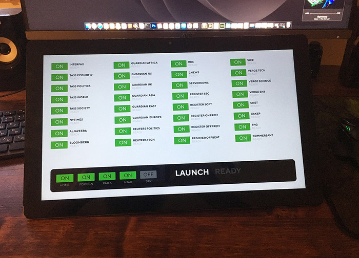 «Трактор» стоит на тумбочке рядом со столом и ждёт нажатия кнопки «Старт / Launch», после чего двадцать обходчиков начинают заполнять базу данных новостями. Результат выглядит так: