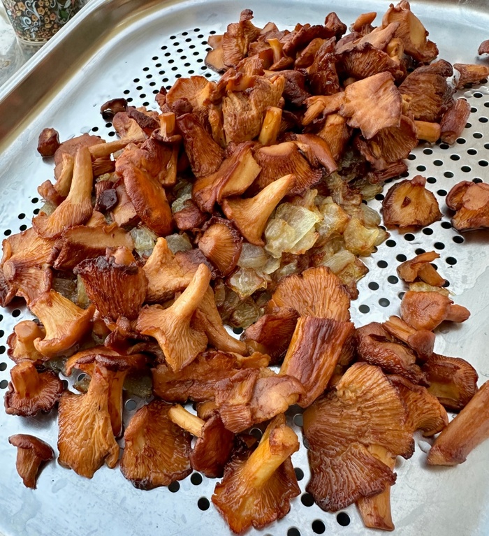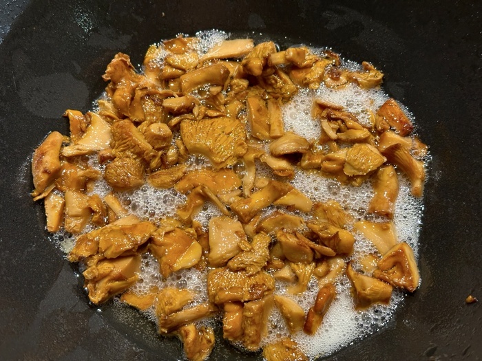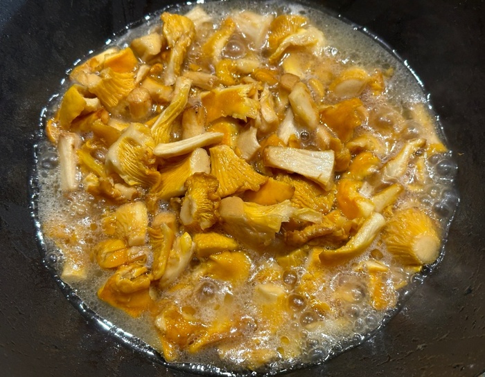 … много сока. Постоянное перемешивание нужно для того, чтобы лисички жарились именно в смеси масла и сока.