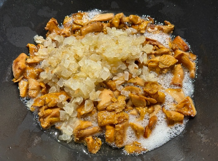 Лук надо заранее зазолотить – примягчить. И к лисичкам его.