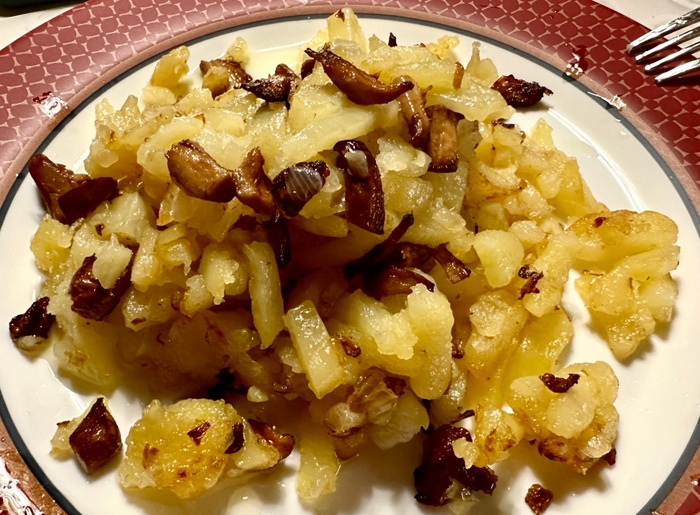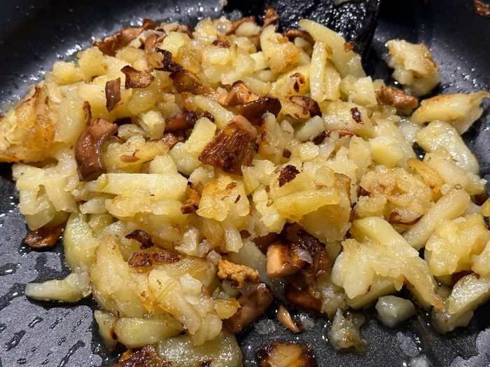 И на среднем, или чуть ниже среднего, нагреве, довести до готовности. Тут «готовность» скорее должна стать видовая. Потому что, в принципе, и картошка и грибы уже готовы.