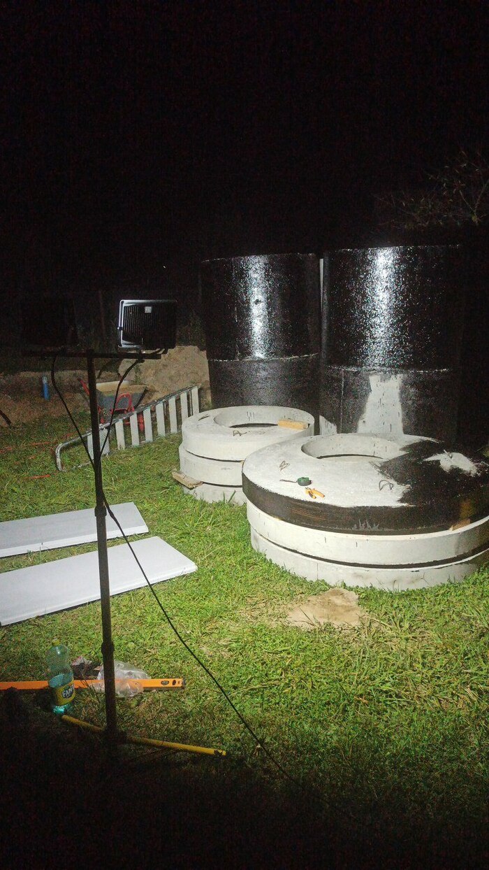 На след.утро вторым слоем праймера, а уже к обеду резинобитумной мастикой, к ночи вторым слоем. Утром, когда приехал экскаватор он ещё 1.5 часа двигал кольца так, чтобы участки которые были не промазаны, я мог промазать пока он копал ямы под канализацию(септик) и дренаж. Сам процесс установки не фоткал, было немного не до того.