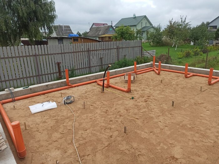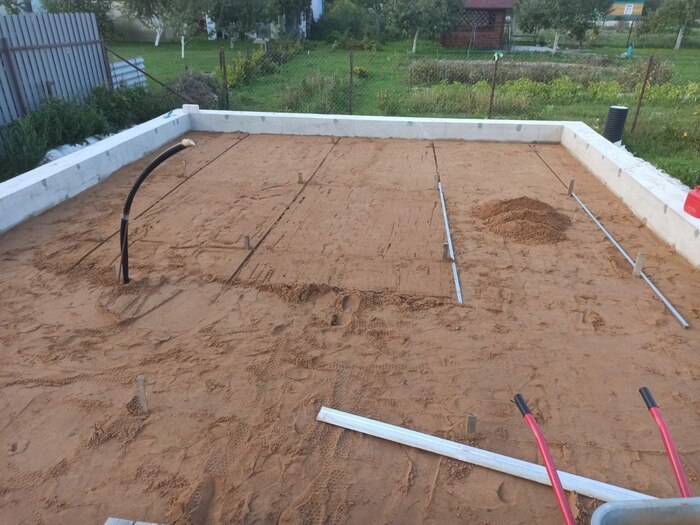 Честно скажу, немного очковал за "прочность/плотность" основания, хоть и трамбовал это всё послойно трамбовкой по 150мм на слой. Ну и в качестве перестраховки, решил в местах будущих перегородок закинуть пруты арматуры. Сейчас уже не вспомню, но вроде бы 8-ка: