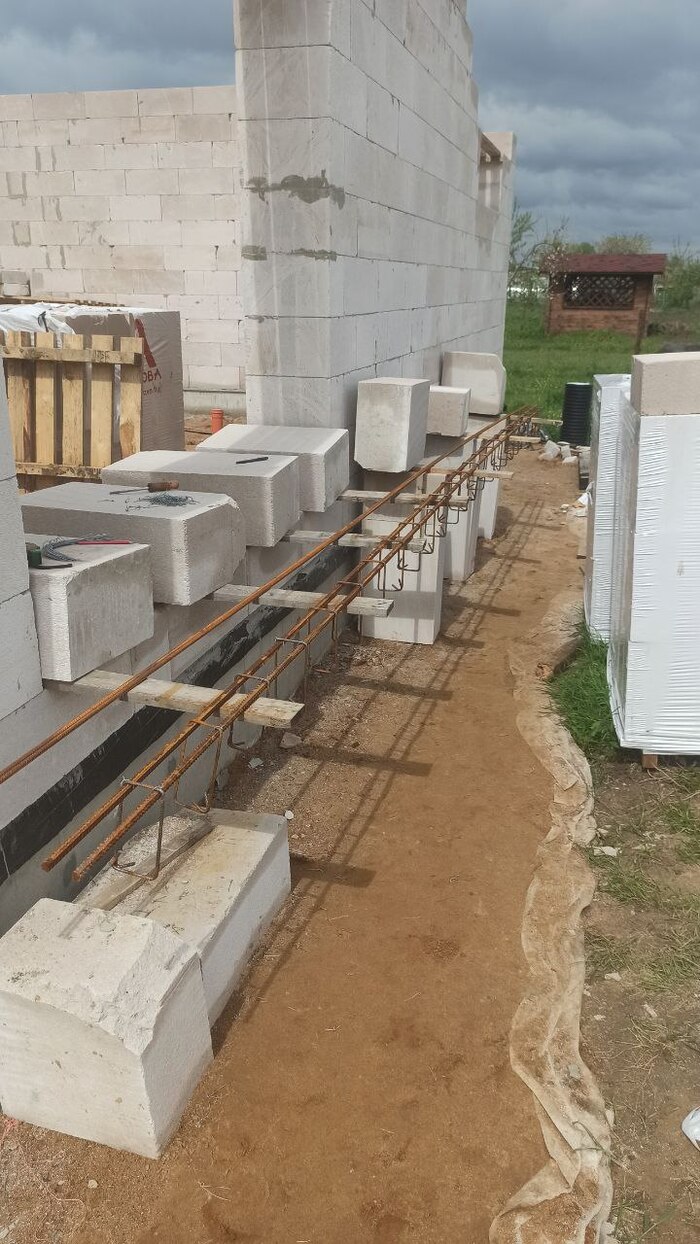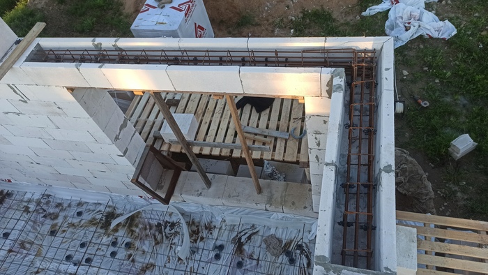 Снимал последовательно часть стульчиков, при помощи обычно степлера крепил "стульчики" к кускам заранее нарезанного ЭППС. Собственно дальше было закидывание арматурных каркасов для надоконных балок в лотки блоков. И тут я вам скажу, вот реально, лучше или берите готовые балки из газобетона или бетонные перемычки, но лучше 1-ые если ширина оконного проём не очень большая, ну или 2-ый если ширина > 2300мм. Потому как время потраченное на запиливание U-блоков, а потом ещё на заливку и на "подождать" когда залитые перемечки наберут прочность - да в #$@! я @#!@$! такие ночи... Собственно связанные и уложенные каркасы над самым большим окном (пролёт 2400мм) и угловым окном
