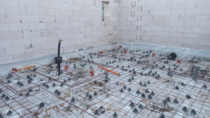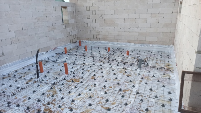 А, ну и вот тут, я вспомнил, что черновая стяжка у меня 120мм. Ну так получилось, а в наличии были только 35мм "стульчики" для сыпучих основания, и меня не очень устроил тот факт что арматурная сетка будет в самой нижней части бетона. А с учётом того, что у меня валялись 2 или 3 листа ЭППС 30мм было принято решение пере@$@%@#ть всё по новой: