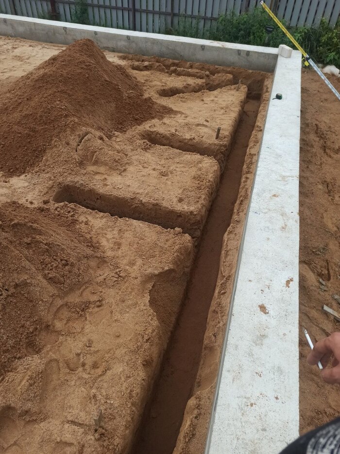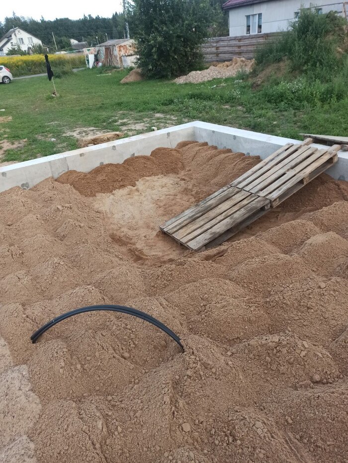 Потом был небольшой перерыв, т.к. решил не рисковать и не укладывать на стенки фундамента деревянные брусья(а как иначе завозить песок во внутрь фундамента)... Ну а потом песок во внутрь фундамента. Сказано - сделано. Собственно на фото ниже, завершение засыпки 1-ого слоя. Кстати виден "кусок" пандуса по которому это всё завозилось во внутрь