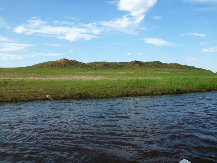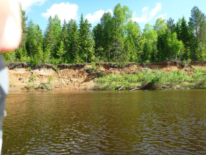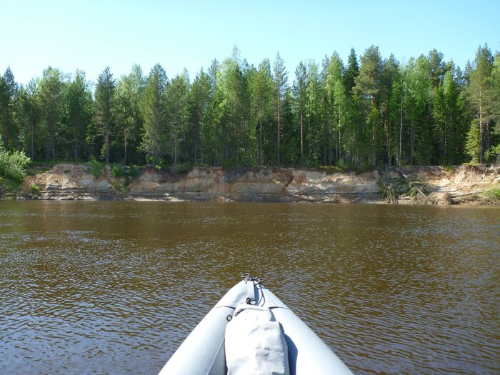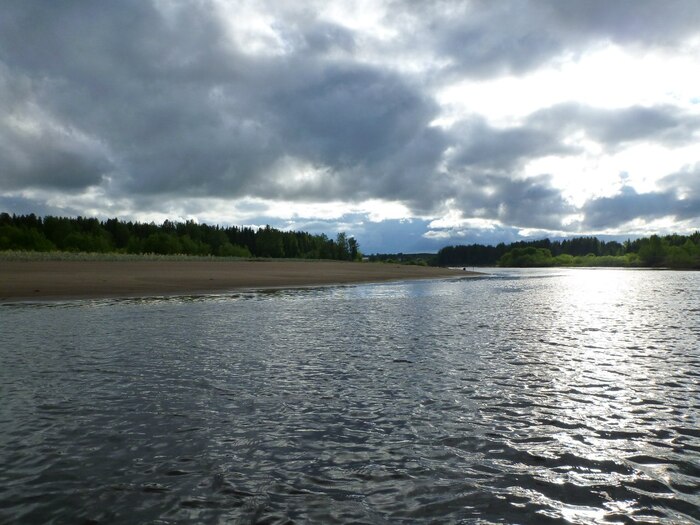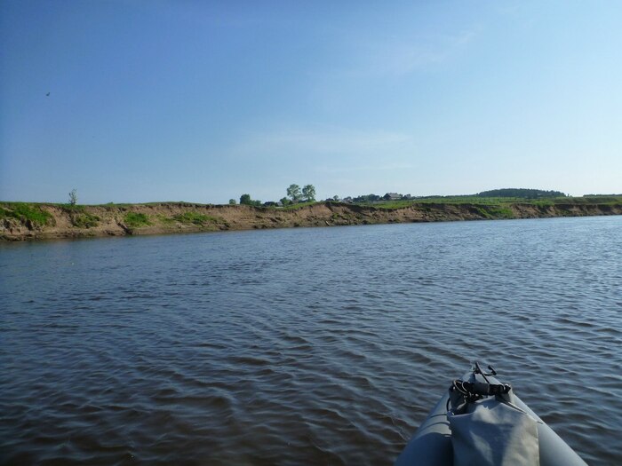 Двигался я в целом на север, поэтому ветер стабильно дул встречный, и я греб, греб и греб, пытаясь прятаться под берегами, с твердым намерением финишировать сегодня. Было не до красот. Размышлял о том, что неплохо, наверное, было бы облегчить концы весла процентов на 30-40, а отталкиваться не веслом, а срубить специальный шест... На широких местах добавлялись идущие против течения волны, впрочем, на такой реке небольшие.